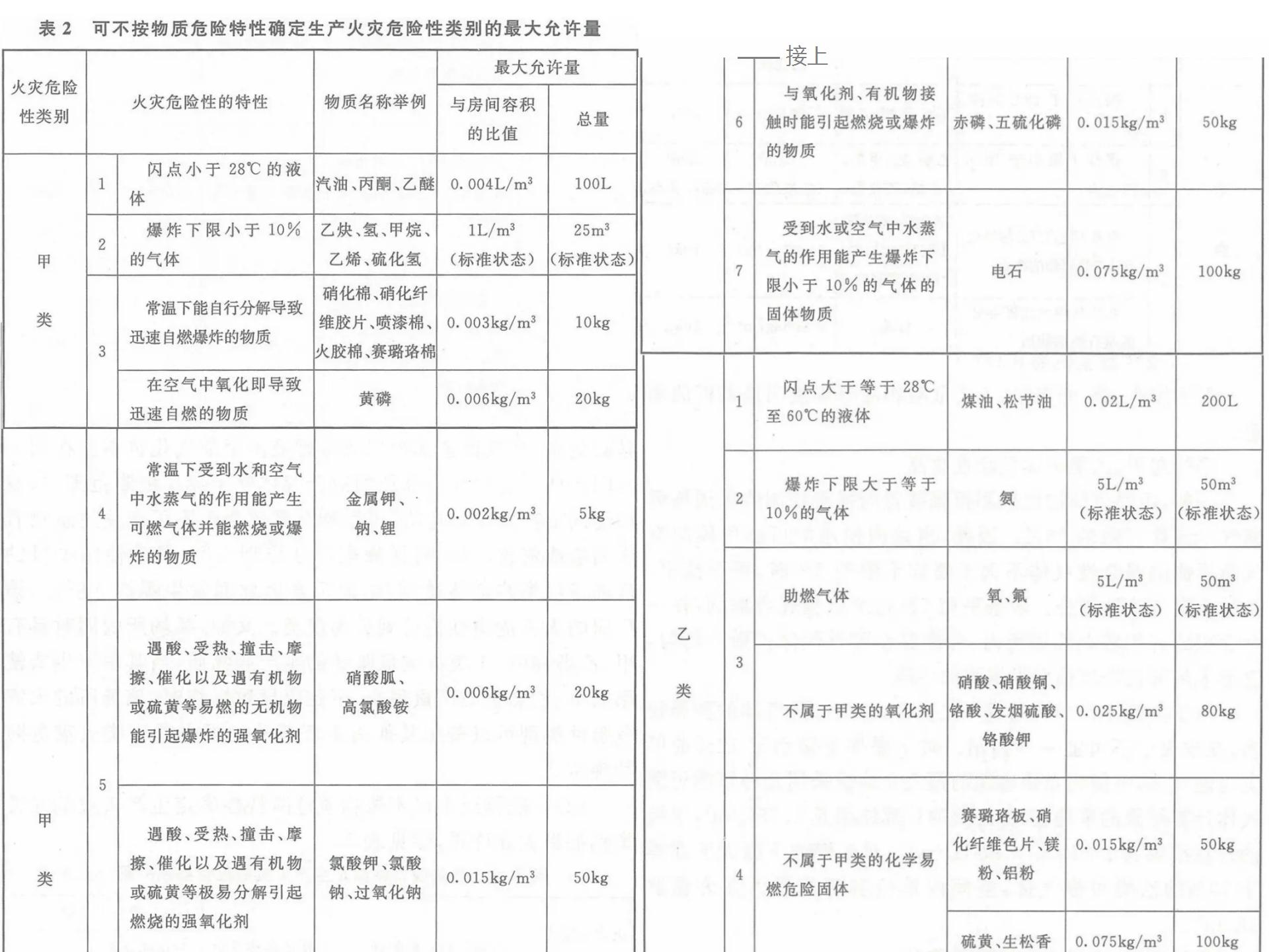 表2列出了部分生产中常见的甲、、、、乙类火灾危险性物品的最大允许量。。本表仅供使用本条文时参考。。。现将其计算方法和数值确定的原则及应用本表应注意的事项说明如下: